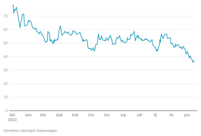 Ceny plynu klesly za poslední dva měsíce téměř o 40 procent, ukazuje graf. Může za to teplé počasí a nízká spotřeba, díky čemuž jsou evropské zásobníky téměř na historických maximech.