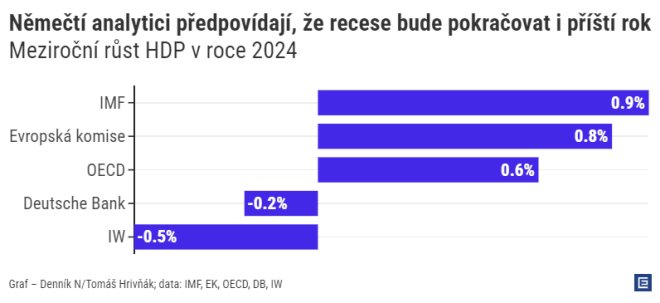 Německo se bude v roce 2024 dále trápit s recesí, ukazuje graf z prognóz několika institucí. Zatím nejhorší je čerstvá předpověď německého institutu IW, podle níž se ekonomika propadne o půl procenta.