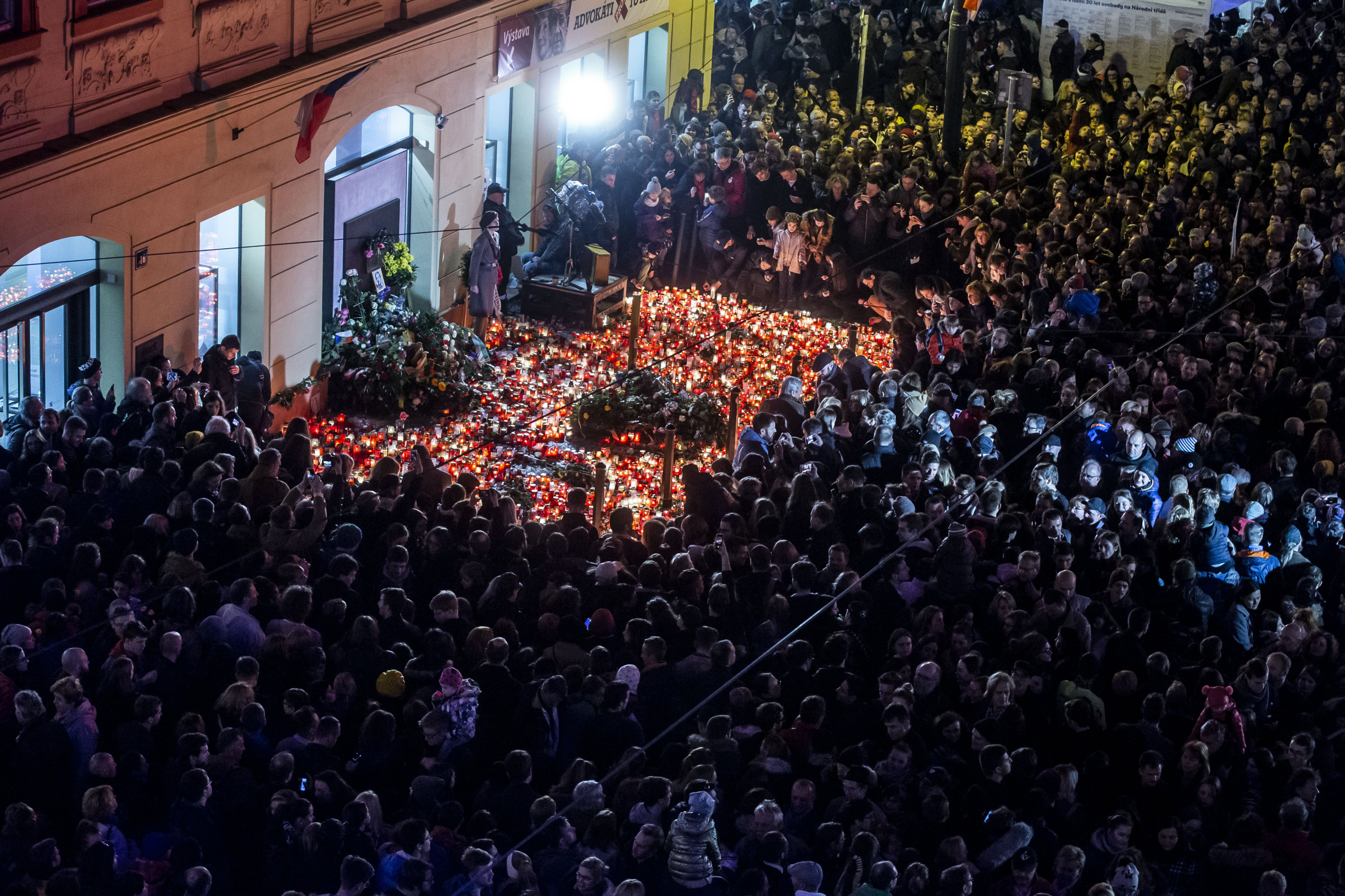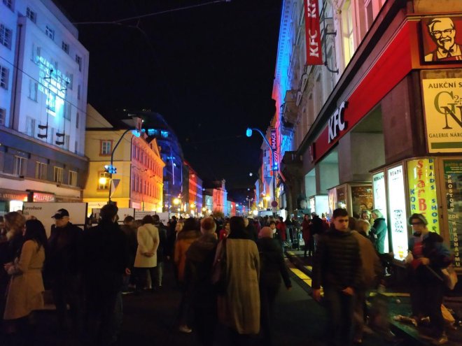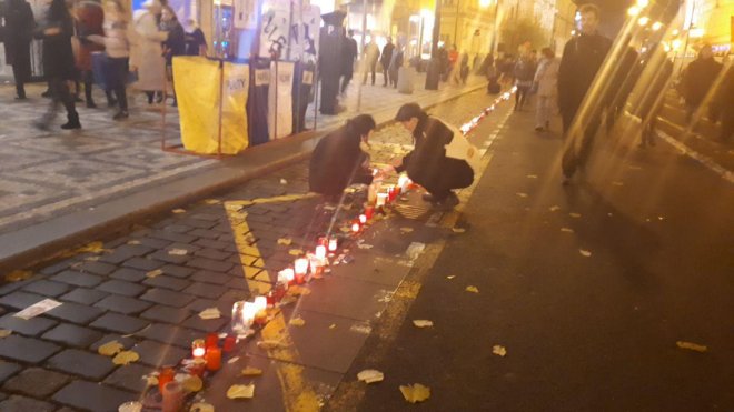 Národní třída se vyprazdňuje. Organizátoři uklizejí, návštěvníci vytvořili řetěz ze svíček.