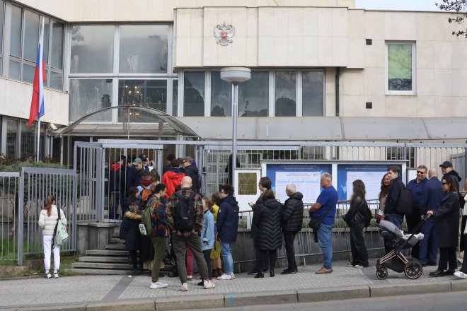 Desítky Rusů dnes dopoledne přišly na ruské velvyslanectví v Praze, aby se zúčastnily hlasování o prezidentovi. Od brány velvyslanectví se tvořila na Skakunově mostě několikametrová fronta a postupně přicházeli další lidé.