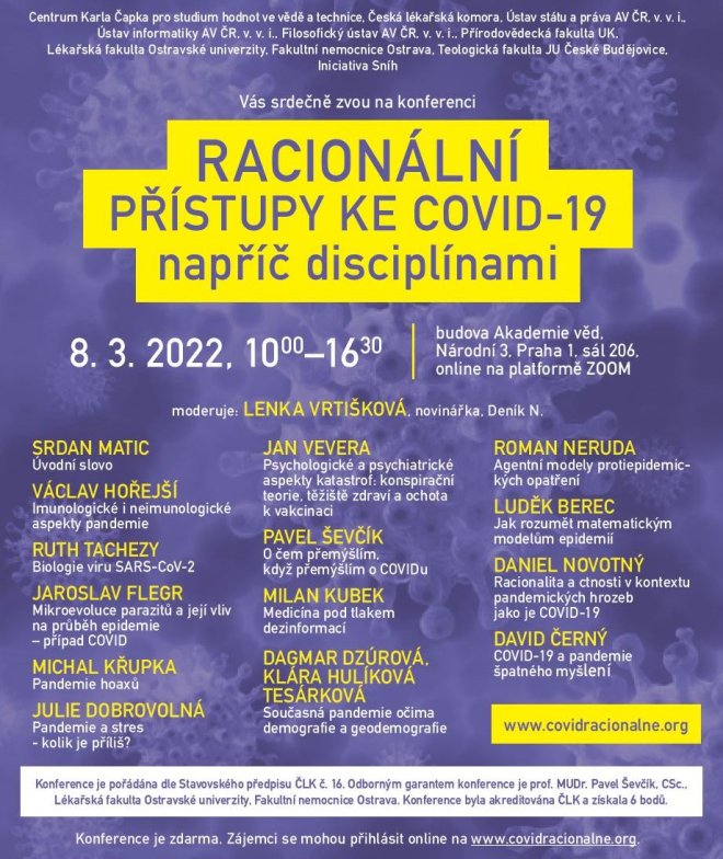 Za dvěma roky pandemie se ohlédne čtrnáct osobností české vědy a medicíny na konferenci Racionální přístupy ke covidu-19. Začne zítra od 10 hodin v budově AV ČR v Praze a dostupná bude i online. Moderuje redaktorka Deníku N Lenka Vrtišková Nejezchlebová.